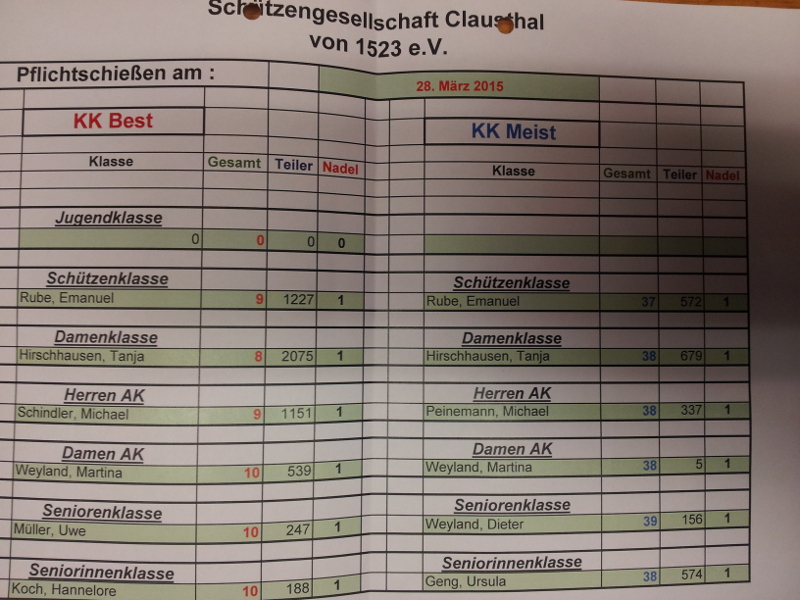 Am Samstag, den 28.3. fand das traditionelle Anschießen der SG Clausthal statt. Bei guten Wetterbedingungen wurden die ersten Best- und Meistwürden des Jahres mit dem Kleinkalibergewehr ermittelt. Weiter nutzte man den Nachmittag um auch die Grillsaison mit den ersten Bratwürsten des Jahres zu eröffnen. 29 Schützenschwestern und Schützenbrüder nahmen teil. Die Ergebnisse liegen in diesem Jahr leider nur "abfotografiert" vor: