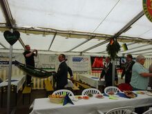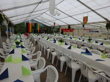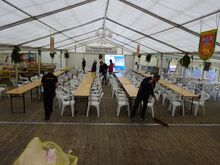 Ab und zu gibt es neue, liebevoll vom Festausschuss gebastelte Tischdekoration. Kaum dass das Eindecken fertig ist, erscheint Fa. Eine mit den "Fressalien", die auch auf die Tische verteilt werden müssen. Wenn alles gut klappt, ist der Festausschuss fertig damit bevor die Gäste, die immer zu früh erscheinen, eintreffen. Die stehen zum Teil optimal im Weg, manche sind aber auch so nett und helfen mit.